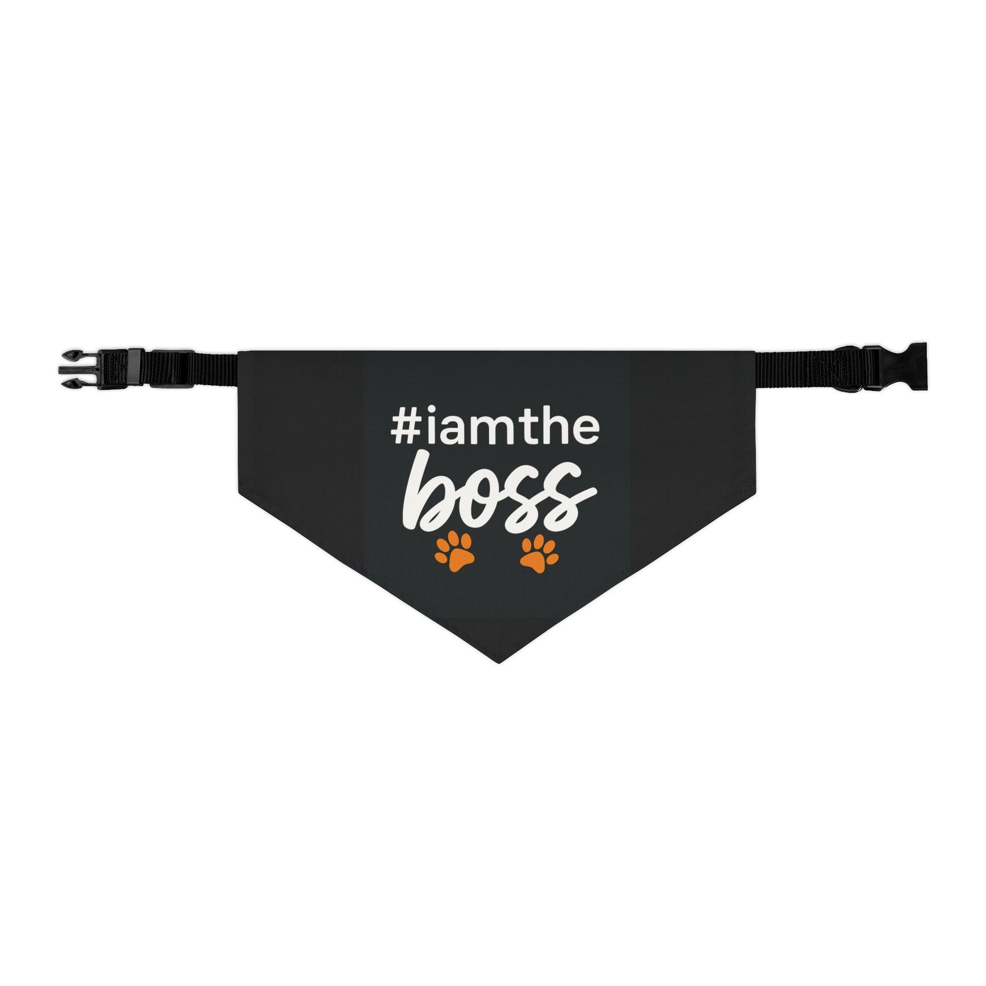 Pet Bandana Collar – "#iamtheboss" Black Dog Bandana with Paw Print Accents